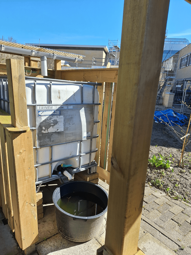 We hebben geen water in de Ruiltuin, maar mogen, in lege flessen van 2 liter, water uit de dierenweide ophalen. Dat betekent ook dat er eigenlijk geen gietwater beschikbaar is voor de potten op de plantentafels. Gelukkig hebben we inmiddels een regenwateropvang van 4000 liter. Via de dakgoten komt de neerslag in vaten van 1000 liter terecht en daarvan hebben we er inmiddels 4 staan en daarmee kunnen we een tijdje vooruit. Regenwater is beter voor de planten en het gebruik is milieuvriendelijker dan het gezuiverde drinkwater uit de kraan. André Kolk zorgde voor de dakgoten en de afvoer naar de vaten.